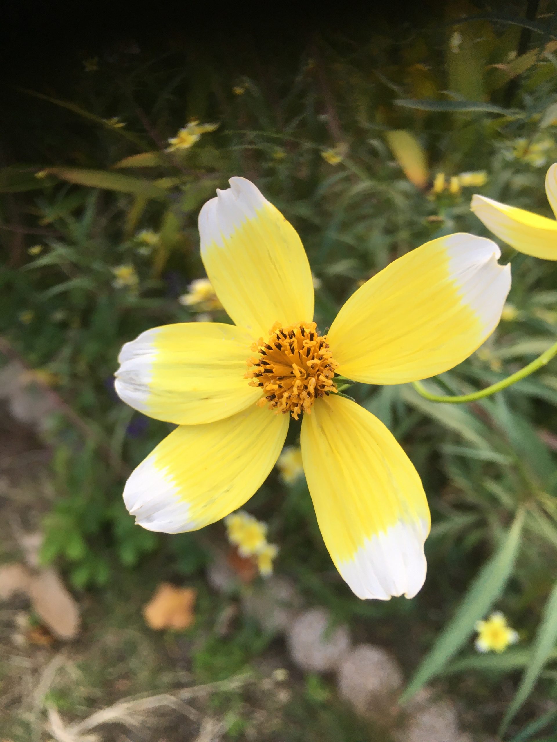 散歩の途中の市民センターで黄色いコスモスが咲いているのに出会った: